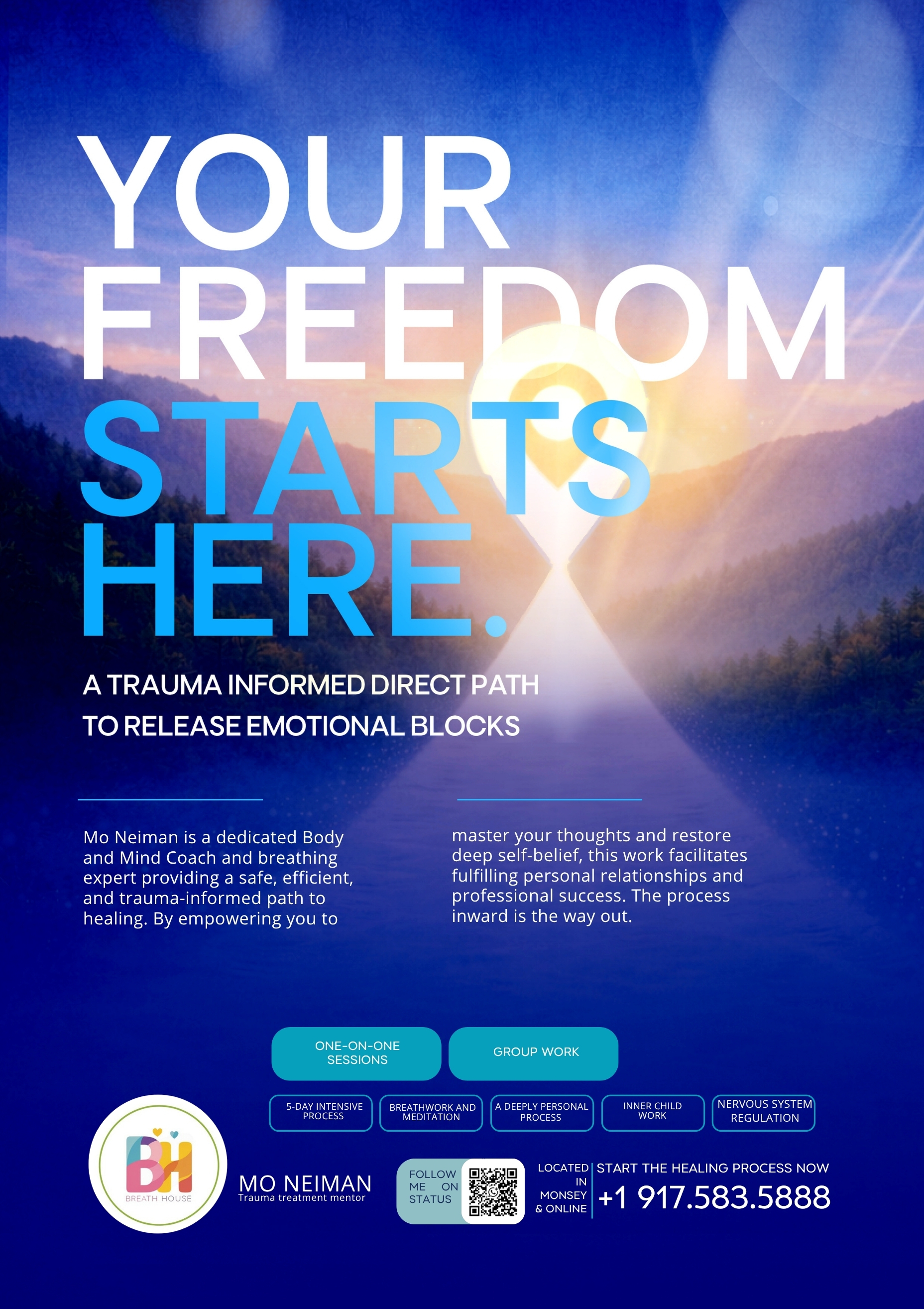 Mo Neiman is a dedicated Body and Mind Coach and breathing expert providing a safe, efficient, and trauma-informed path to healing. By empowering you to master your thoughts and restore deep self-belief, this work facilitates fulfilling personal relationships and professional success. The process inward is the way out.